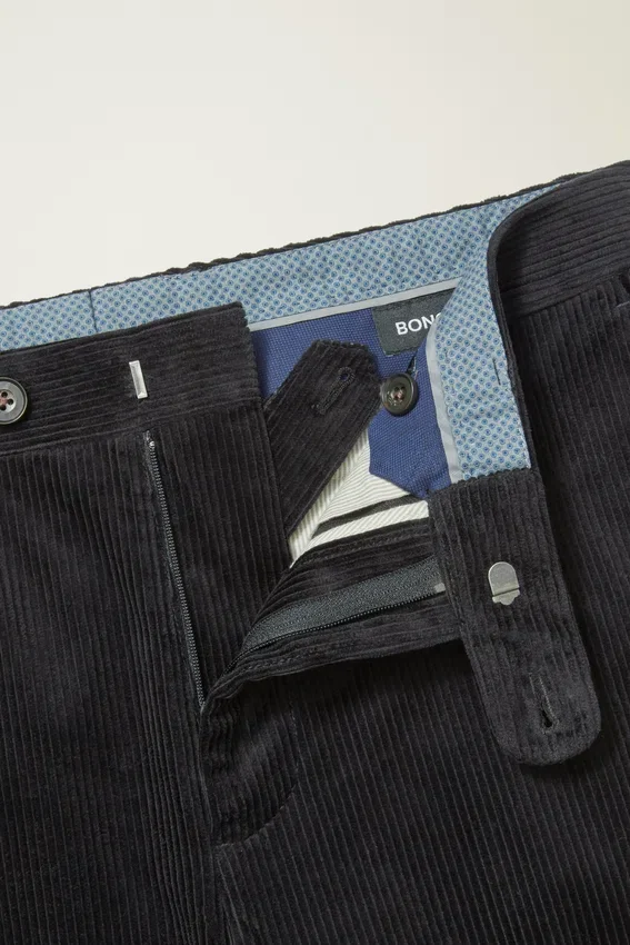 Tejido de pana de lujo fabricado en Italia | Peso para todo el año | Cintura contorneada característica con cortina interior | Cierre frontal con lengüeta extensible y botón | Bolsillos traseros ribeteados con botones | Muesca en el centro de la espalda