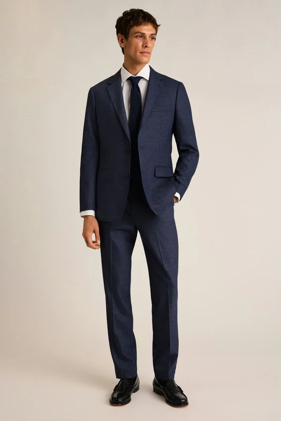 El modelo mide 1,88 m y lleva una talla 32X32 en corte Slim Fit. Los pantalones de traje se pueden pedir con un largo de entrepierna predeterminado o sin dobladillo con un largo de entrepierna de 94 cm para un ajuste profesional.