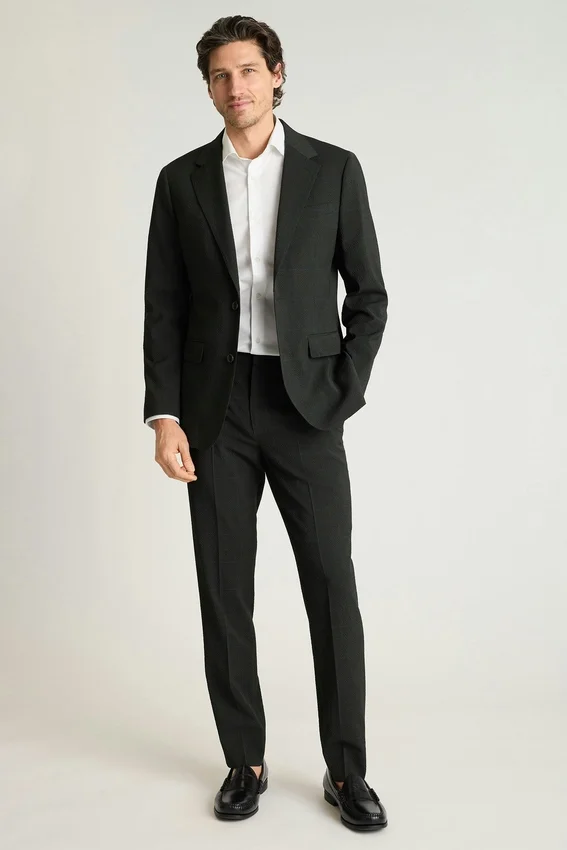 El modelo mide 1,88 m y lleva una talla 32X32 en corte Slim Fit. Los pantalones de traje se pueden pedir con una entrepierna predeterminada o sin dobladillo con una entrepierna de 37″ para confección a medida profesional.