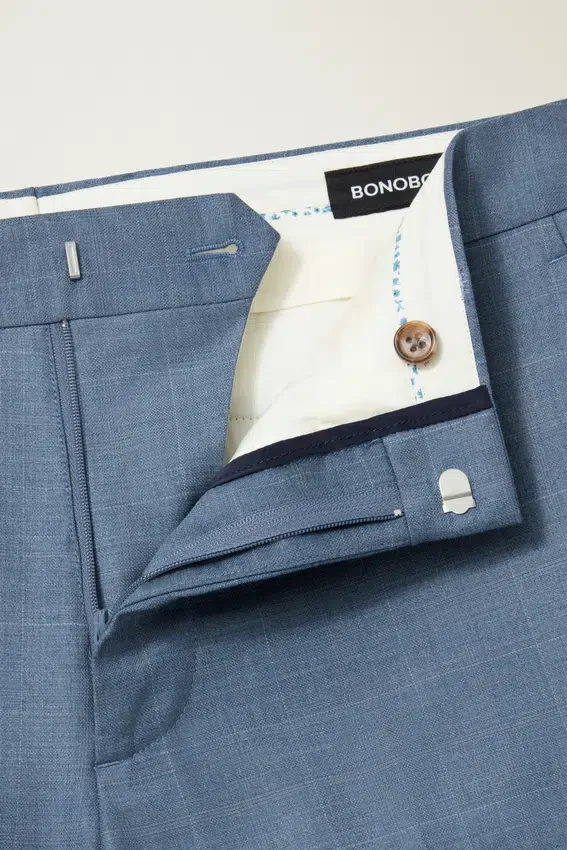 Los pantalones cuentan con un clásico cierre de gancho y barra y bolsillos traseros con botones.