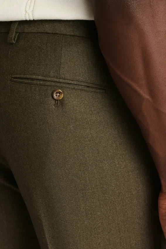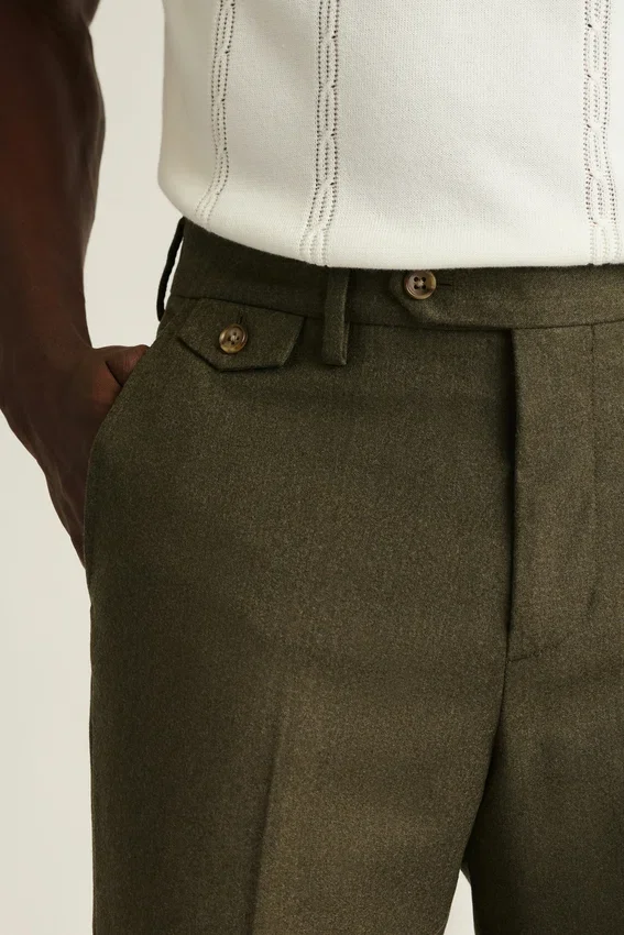 Tejido de Marzotto | Costuras decorativas en el bolsillo del billete y los bolsillos diagonales | La parte delantera de la pierna está forrada hasta debajo de la rodilla | Se puede ajustar en la cintura para un ajuste personalizado