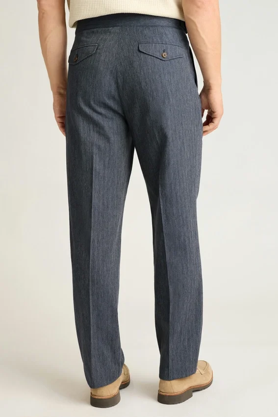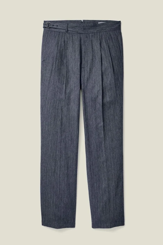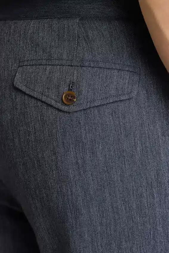 Cintura estilo fajín | Hebilla lateral única para un ajuste personalizado | Bolsillos traseros con solapa | Doble pliegue delantero | Talle ligeramente más alto