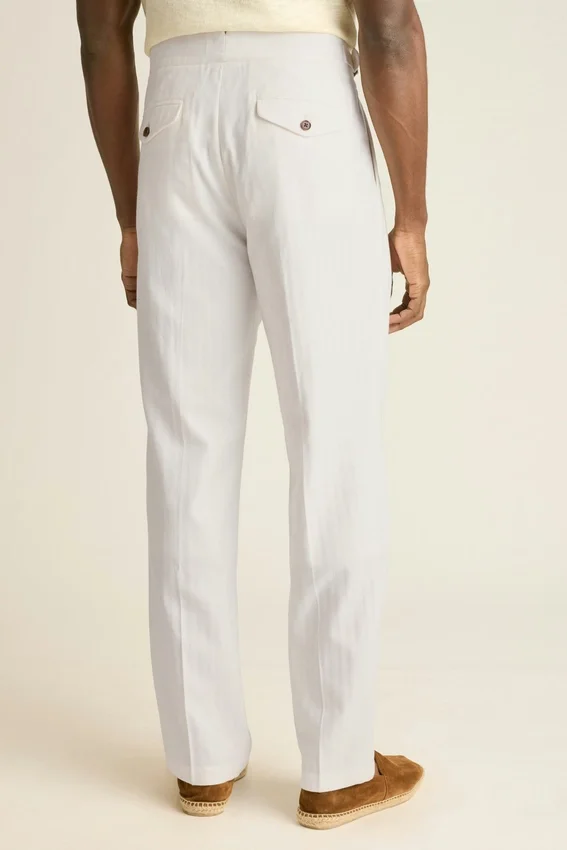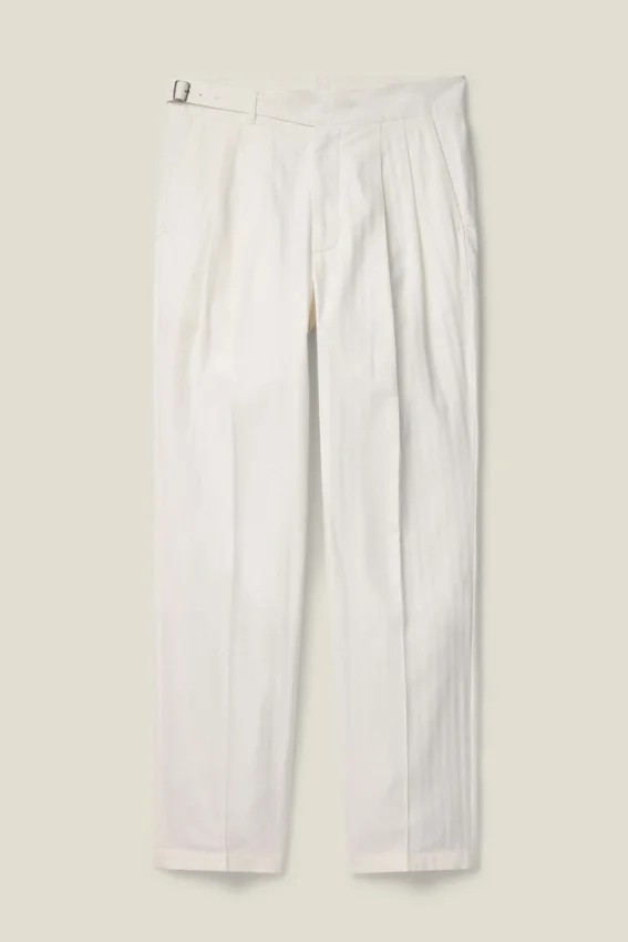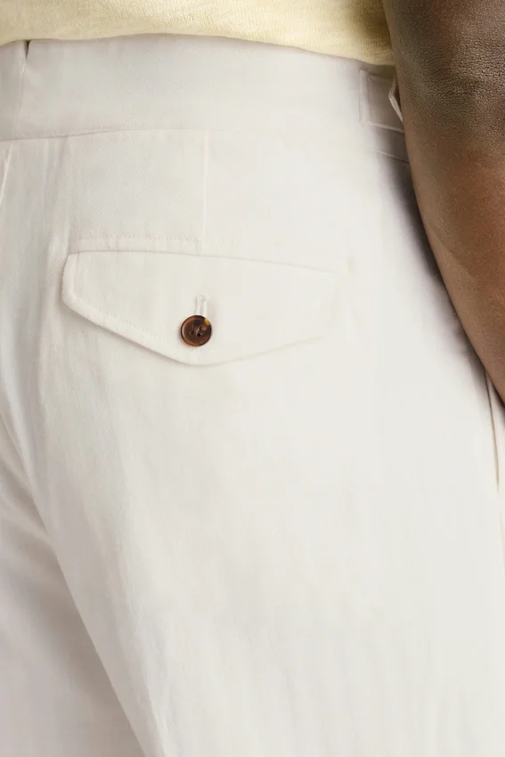 Cintura estilo fajín | Hebilla lateral única para un ajuste personalizado | Bolsillos traseros con solapa | Parte delantera con doble pliegue | Talle ligeramente más alto
