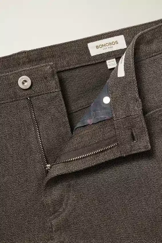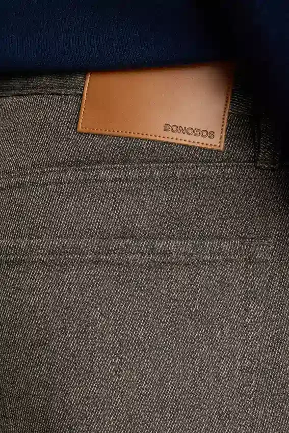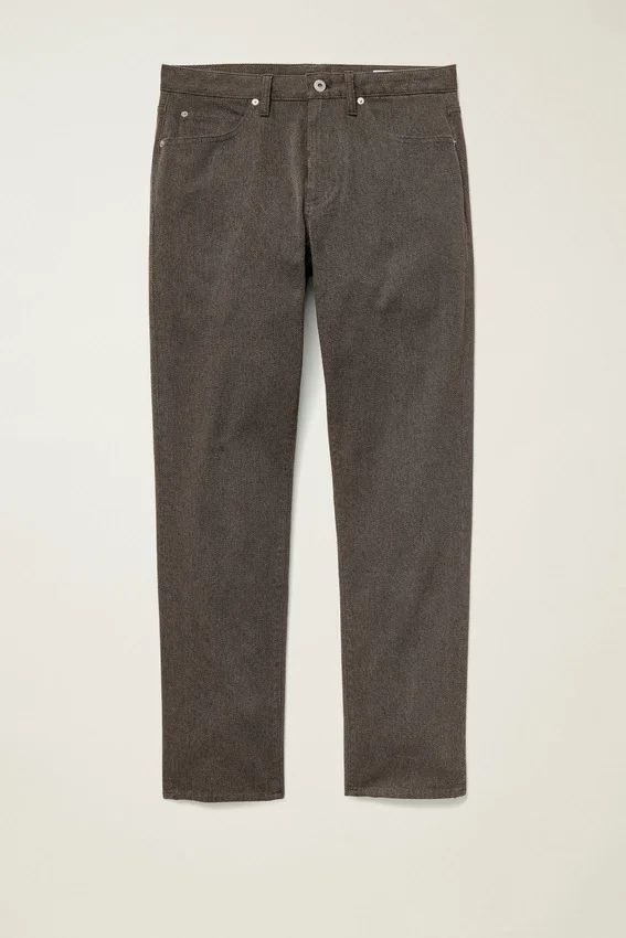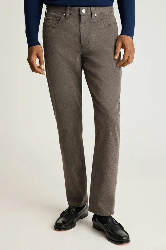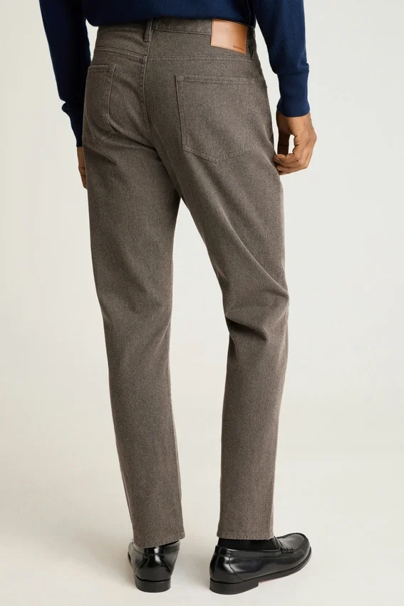 Pantalón de 5 bolsillos de peso medio en algodón elástico teñido en hilo con una sutil textura jaspeada.