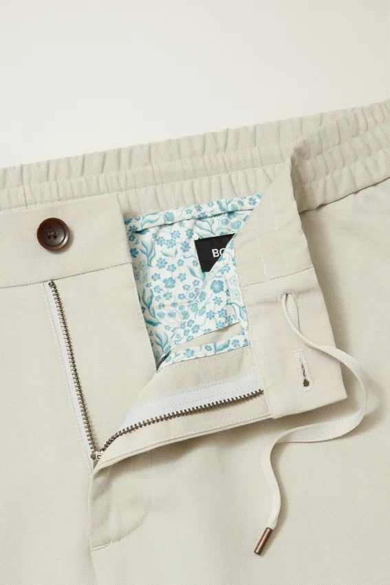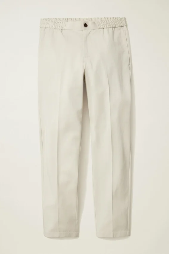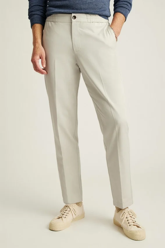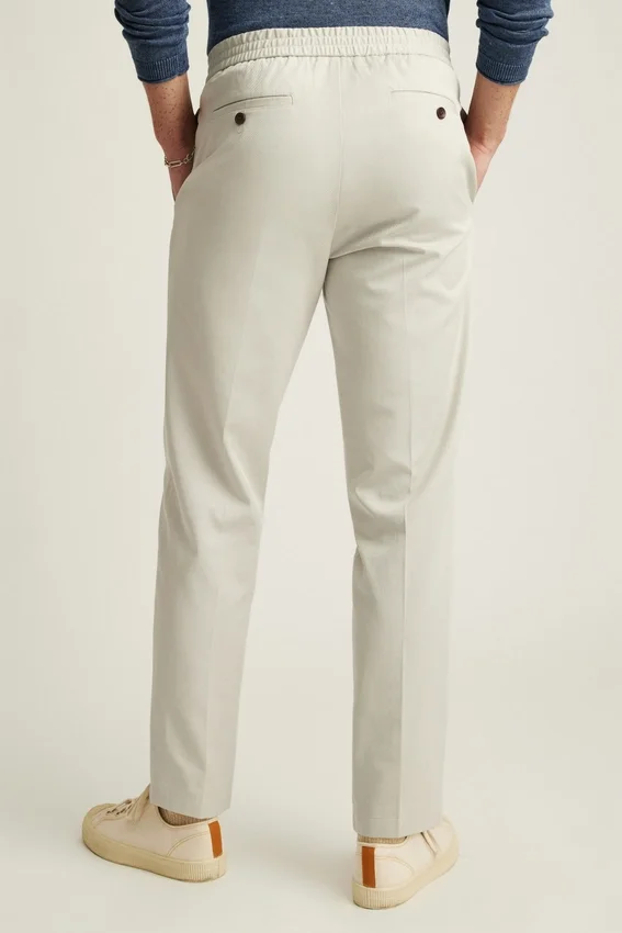 Cintura elástica híbrida | Tejido mezcla de Tencel y algodón | Cordón interior de punto liso | Cierre frontal con botones | Bolsillos traseros con ribete y cierre de botón