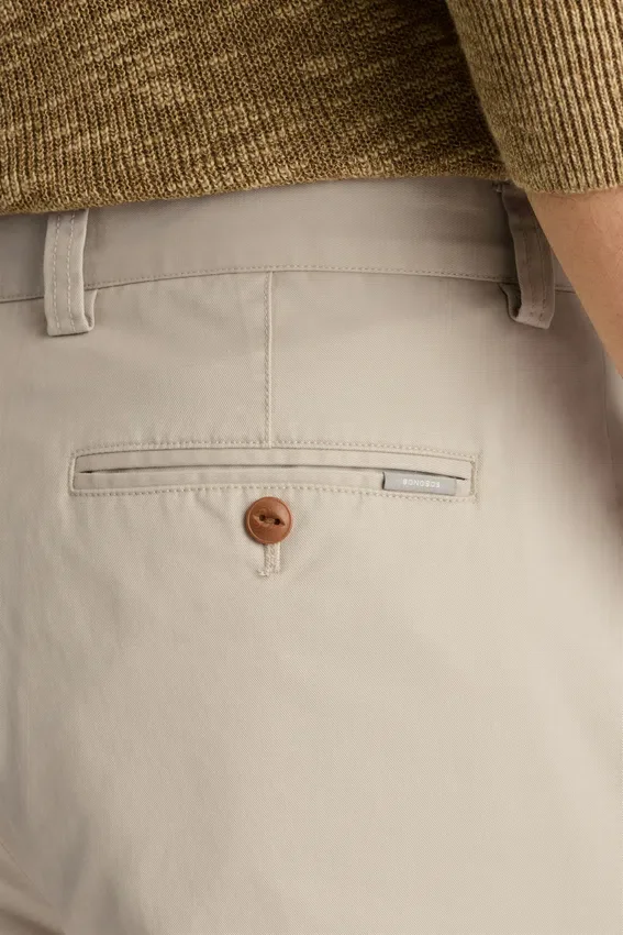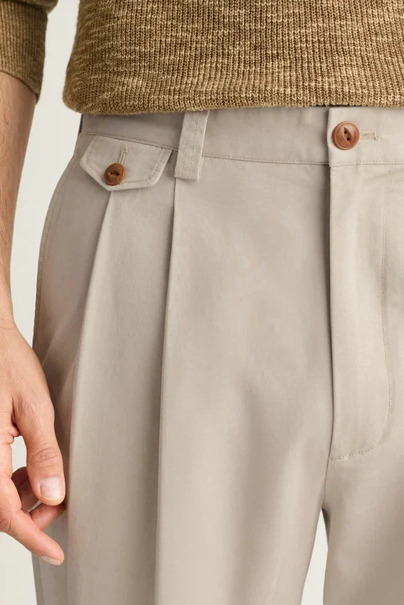 Tejido chino original con lavado a la piedra | Pliegues dobles | Bolsillo para monedas con solapa | Bolsillos traseros con ribete y cierre de botón