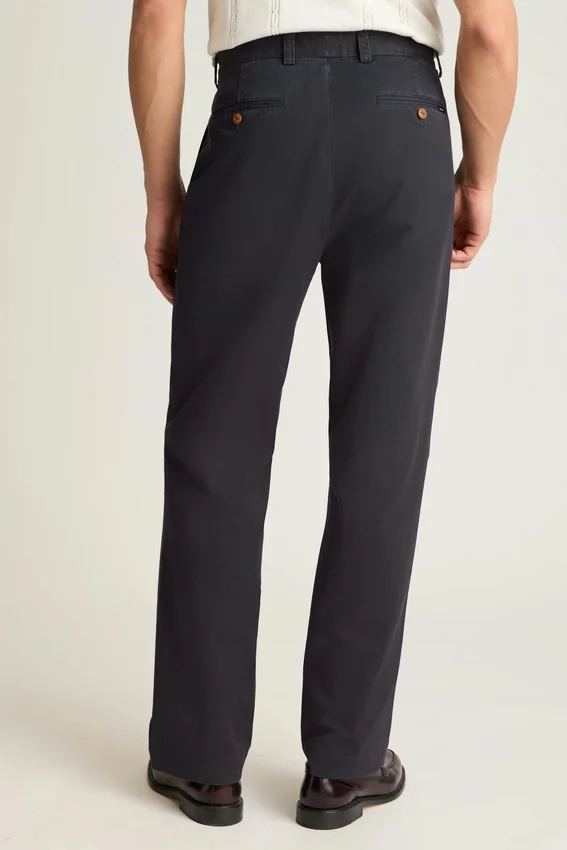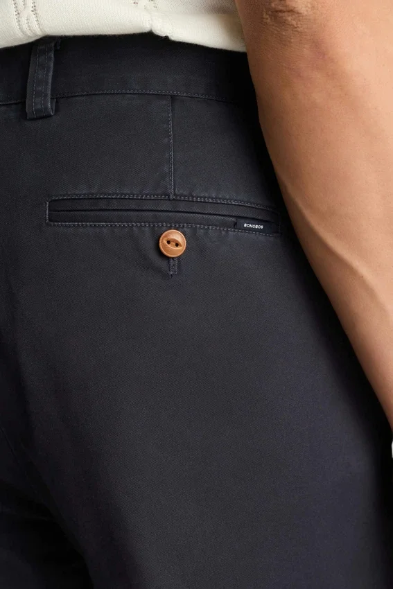 Tejido chino original con lavado a la piedra | Pliegues dobles | Bolsillo para monedas con solapa | Bolsillos traseros con ribete y cierre de botón