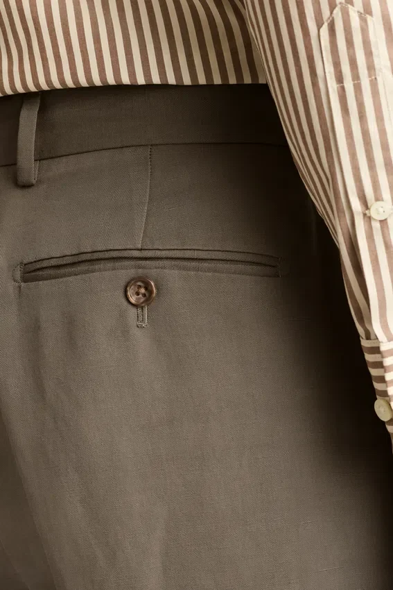 Tejido de la fábrica Duemilagori en Italia | Cierre de gancho y barra con lengüeta extendida | Bolsillos traseros con botones | Forro en la parte delantera de las piernas