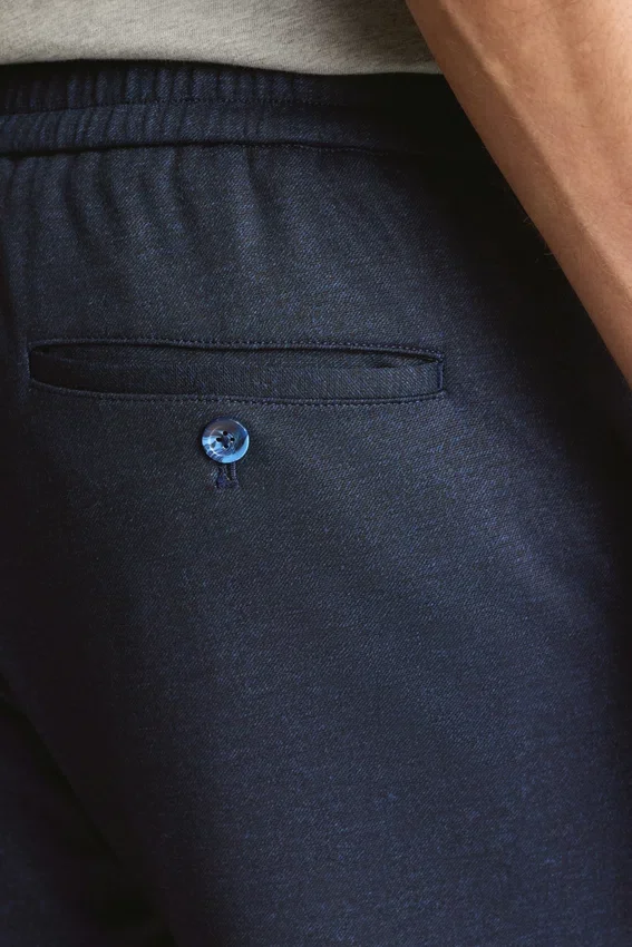 Cintura elástica | Sin cremallera, con cordón ajustable en el interior | Pinzas cosidas en toda la parte delantera de la pierna