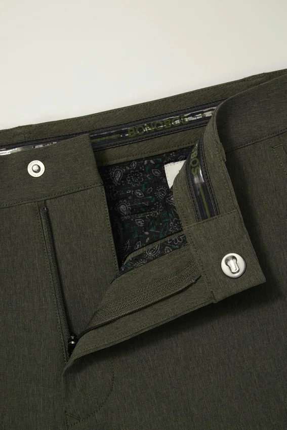 Cintura elástica | Elástico interior en la cintura para sujetar la camisa | Cierre de botón a presión | Bolsillo trasero con cremallera de seguridad | Refuerzo adicional para mayor comodidad y libertad de movimiento | Absorbe la humedad | UPF