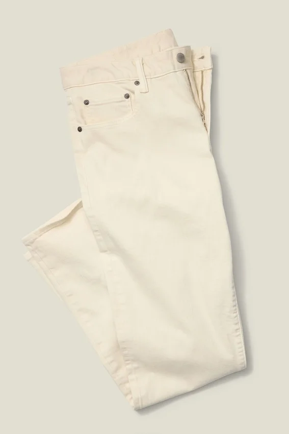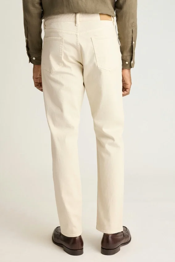 Algodón extra elástico | Teñido en prenda | Diseño de 5 bolsillos | Curved Waistband característica | Herrajes metálicos cuidadosamente seleccionados | Parche de papel con la marca certificado por Oeko-Tex y FSC