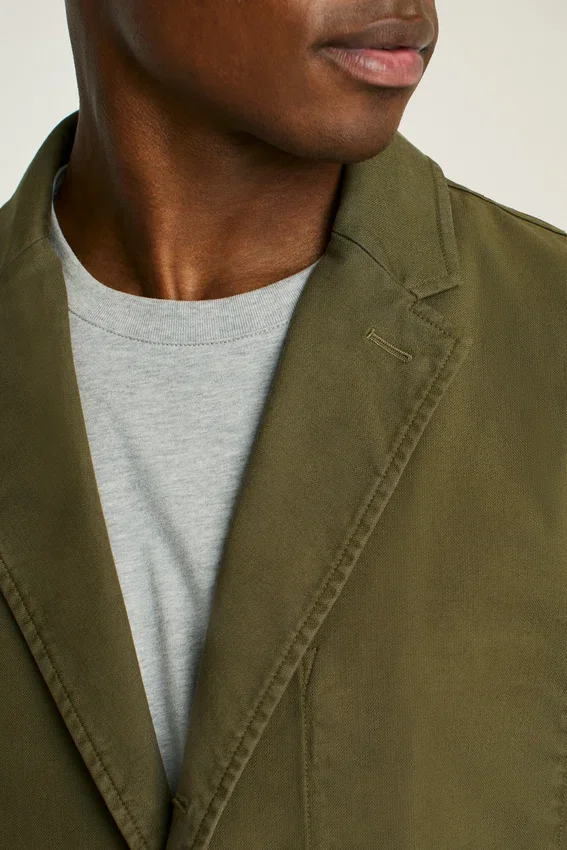 Solapa en V | Corte de tres pliegues y dos botones | Sin forro y Unconstructed | Bolsillos de parche en la cintura | Bolsillo interior | Botones funcionales en los puños | Lazo interior para colgar