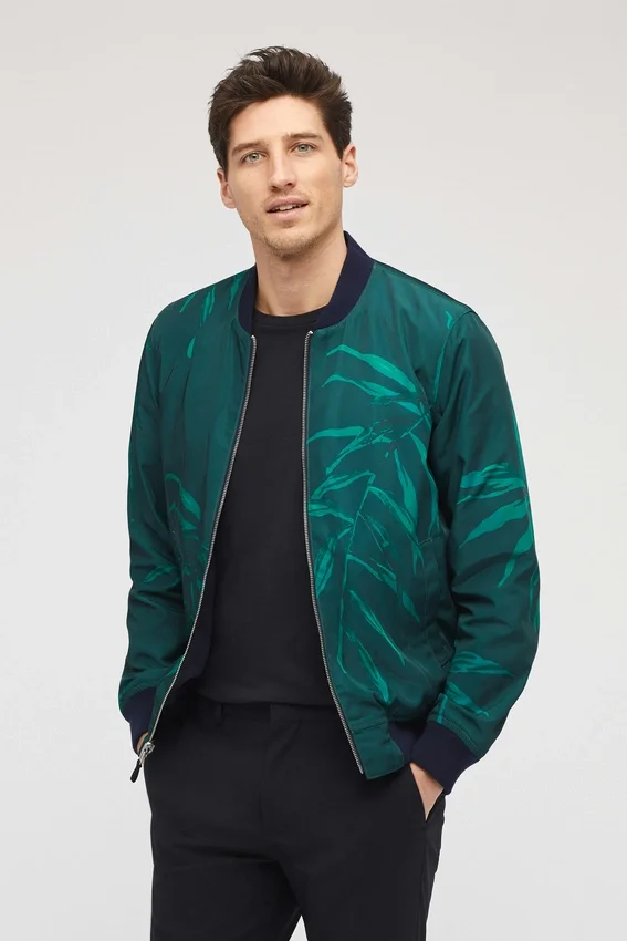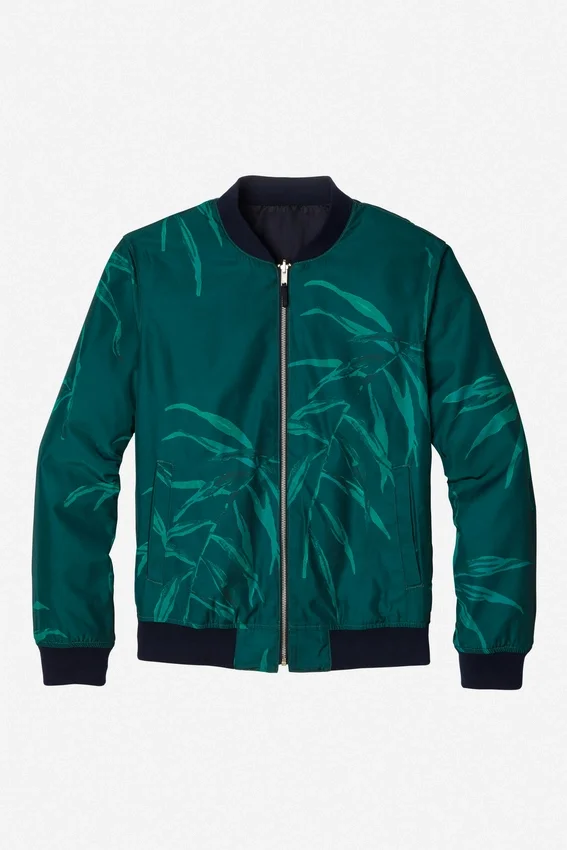 Bomber estampado totalmente reversible. Interior azul marino liso. Cuello y dobladillo acanalados. Bolsillos de mano con ribete simple.