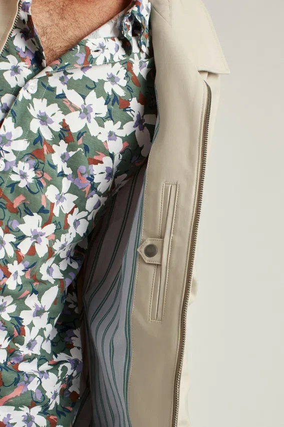 Totalmente forrada con un estampado de cuadros personalizado | Cierre de cremallera en la parte delantera | Lengüeta con botones en los puños | Elástico parcial en el dobladillo de las costuras laterales | Bolsillos de parche oversize con entrada lateral | Lazo para colgar