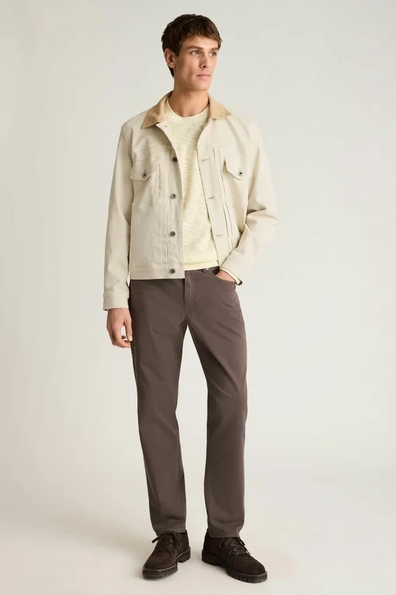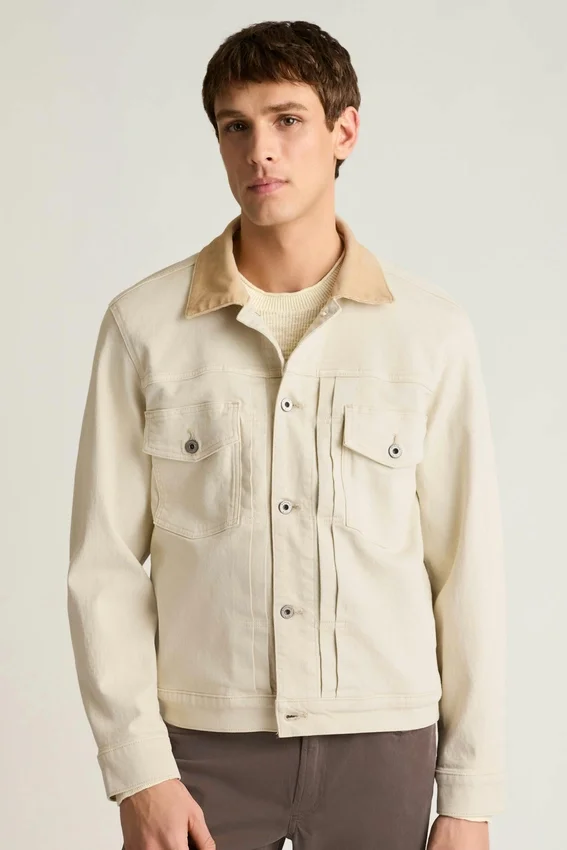 Cuello de pana | Bolsillos dobles en el pecho | Bolsillos en las costuras de la cintura | Bolsillos interiores | Pliegues en la parte central delantera | Lengüetas en el dobladillo trasero | Pespuntes de doble aguja