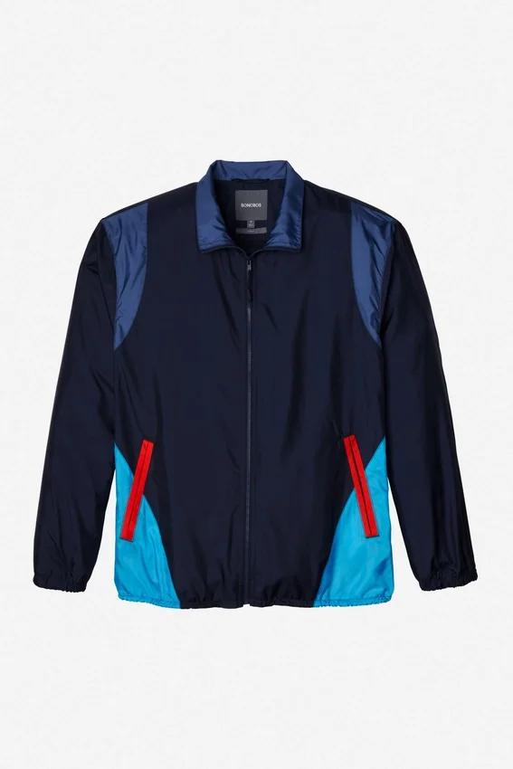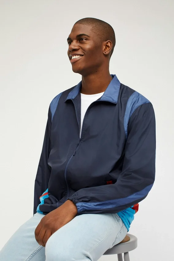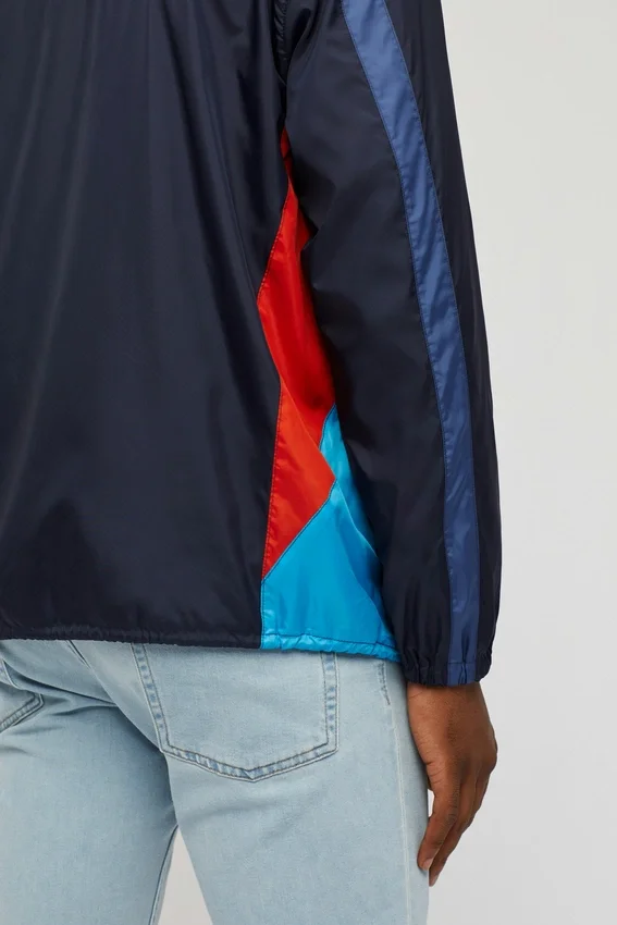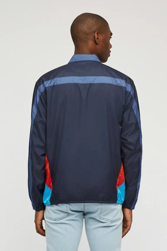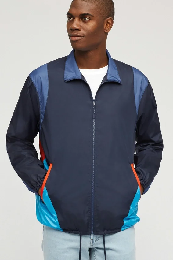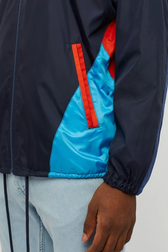Recién salida de los 80, nuestra chaqueta cortavientos de estilo retro. Es azul y azul claro con detalles en naranja. Doble bolsillo para las manos, forro de malla y comodísima. ¡Envío gratis!