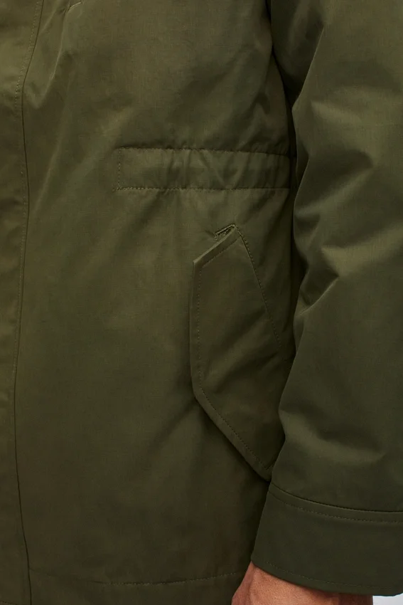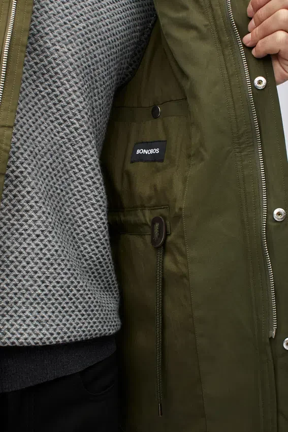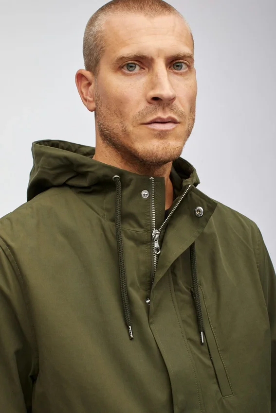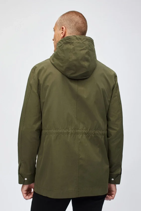 Tejido resistente al agua | Capucha con cordón | Cremallera central delantera y botones ocultos en la tapeta | Bolsillo exterior en el pecho con ribete y cierre de cremallera | Cordón interior en la cintura | Bolsillos exteriores con solapa y botón oculto | Botón oculto en el puño de la manga | Parte delantera forrada | Bolsillos interiores con ribete | Esta chaqueta de campo está diseñada para un ajuste ligeramente holgado y ajustable en la cintura. Elige tu talla habitual. Para un ajuste más entallado, elige una talla menos