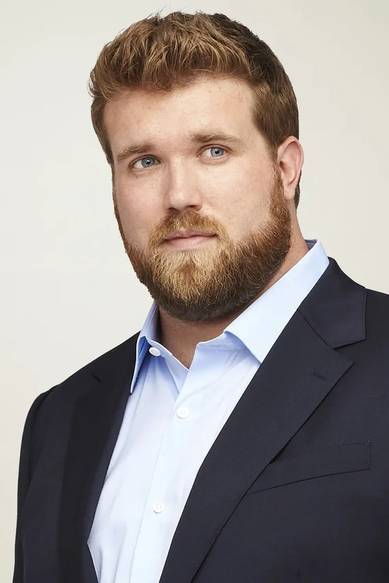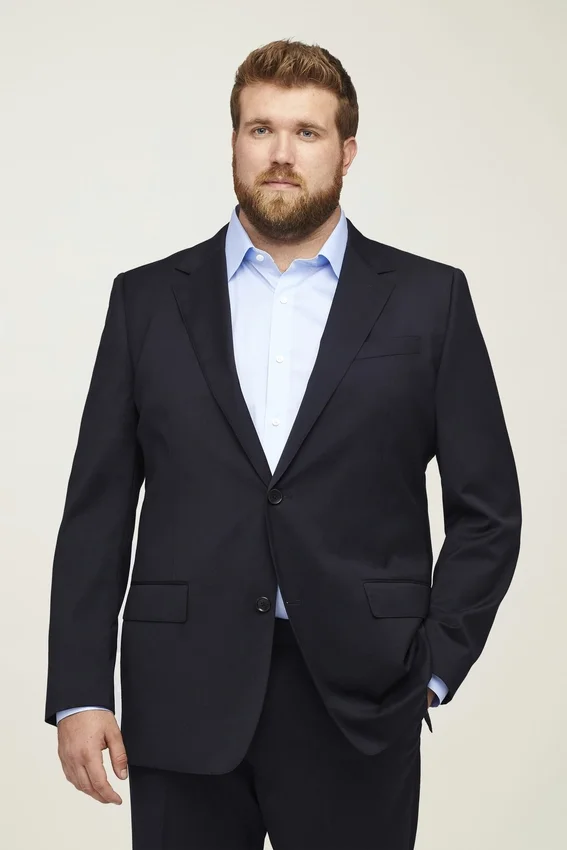 El modelo mide 1,98 m, tiene 127 cm de pecho y lleva una chaqueta de traje 50L.