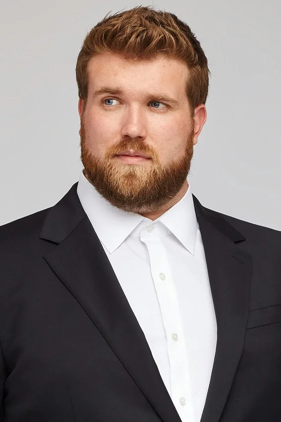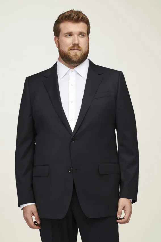 El modelo mide 1,98 m, tiene 127 cm de pecho y lleva una chaqueta de traje 50L.