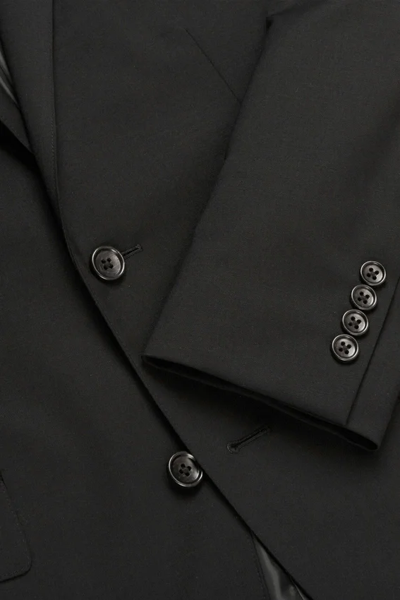 La chaqueta cuenta con solapas modernas con muesca. Tiene doble botonadura, doble abertura trasera, puños con botones decorativos, forro de Bemberg y un bolsillo interior para el pasaporte para cuando viajes. Los pantalones cuentan con un clásico cierre de gancho y barra y bolsillos traseros con botones.
