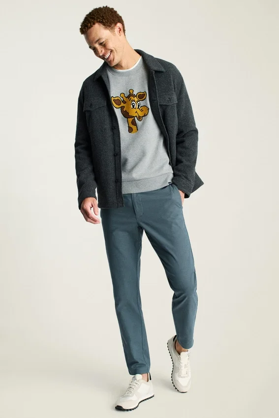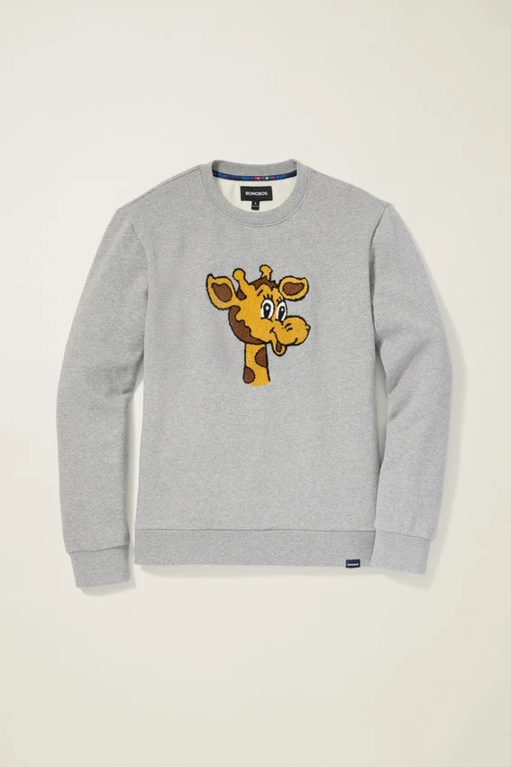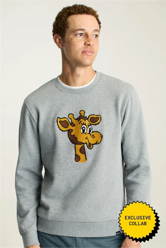 Suave forro polar con Geoffrey bordado en chenilla | Cinta en el cuello con el niño de Toys”R”Us | Etiqueta tejida Bonobos X Toys”R”Us en el dobladillo (levanta el dobladillo del suéter para leer «Soy un niño de Toys”R”Us»)