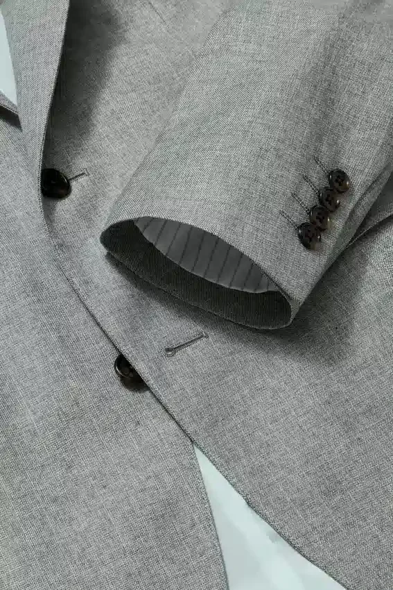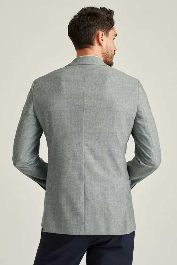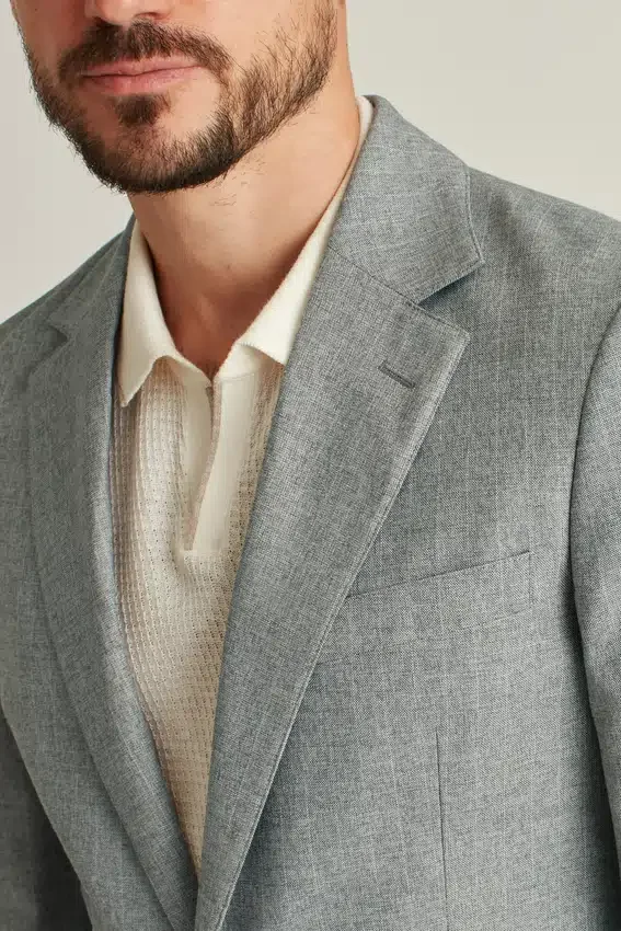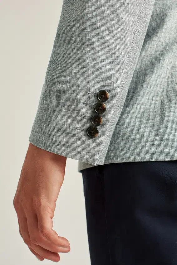 Características de la chaqueta: solapa en V | Bolsillos con solapa | 2 botones, corte sencillo | Interior totalmente forrado | Bolsillos interiores de ojal | Botones decorativos en los puños | Fieltro en el bajo del cuello | Doble abertura trasera | Confección ligera