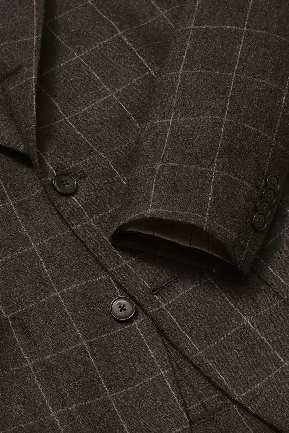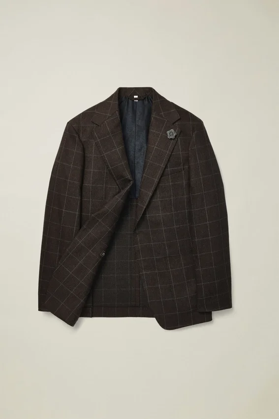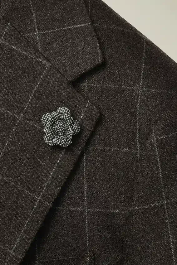 Tejido de lana y cachemira de primera calidad de la fábrica italiana Tollegno | Alfiler de solapa floral confeccionado con retales de tejido Donegal | Medio forrado con forro jacquard personalizado | Forro de manga de Bemberg | Bolsillos interiores con botones de nácar auténtico| Costuras decorativas en toda la prenda | Botones de cuerno auténtico | Botones no funcionales en los puños | Aberturas traseras