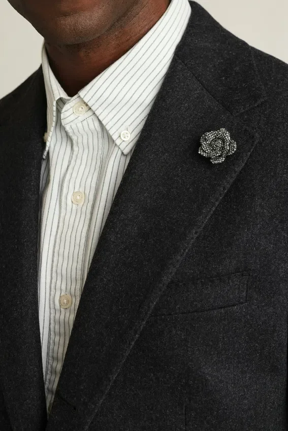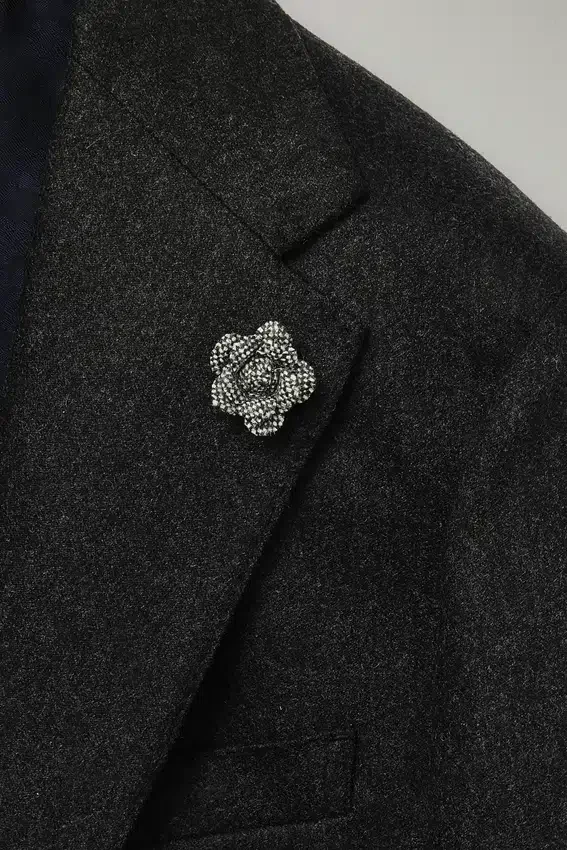 Tejido de lana y cachemira de primera calidad de la fábrica italiana Tollegno | Alfiler de solapa floral confeccionado con retales de tejido Donegal | Medio forrado con forro jacquard personalizado | Forro de manga de Bemberg | Bolsillos interiores con botones de nácar auténtico| Costuras decorativas en toda la prenda | Botones de cuerno auténtico | Botones no funcionales en los puños | Aberturas traseras