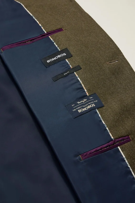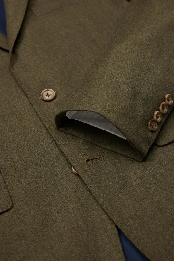 Tejido de Marzotto | Construcción semi-entretelada | Costuras decorativas en el cuello, las solapas y las solapas de los bolsillos | Botones decorativos en los puños | Bolsillos interiores | Interior totalmente forrado | Forro en las mangas | Aberturas traseras