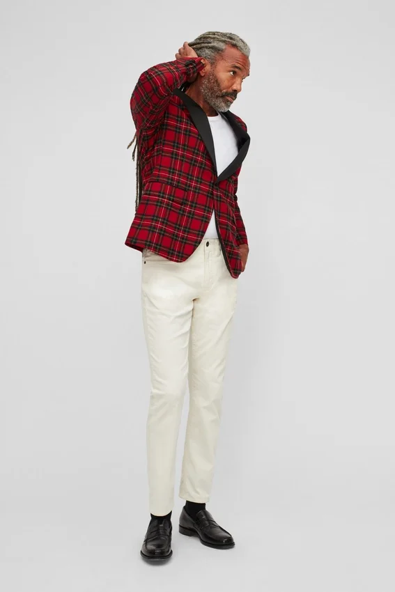 El modelo mide 1,88 m, tiene un contorno de pecho de 102 cm y lleva una chaqueta de traje 40R.