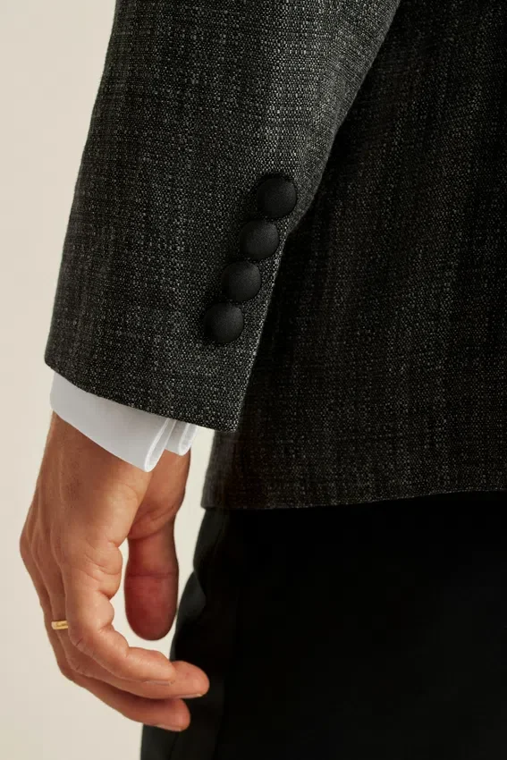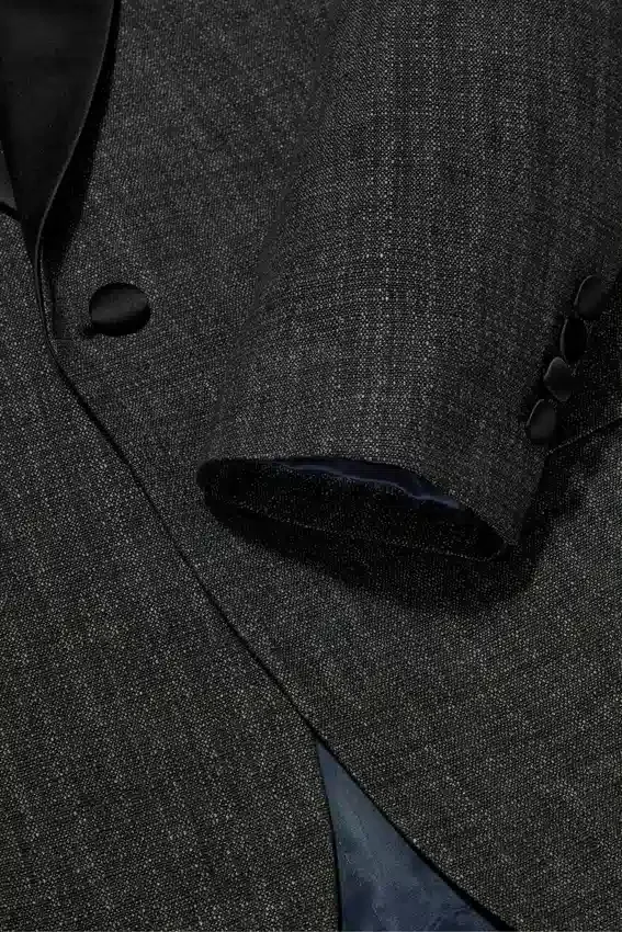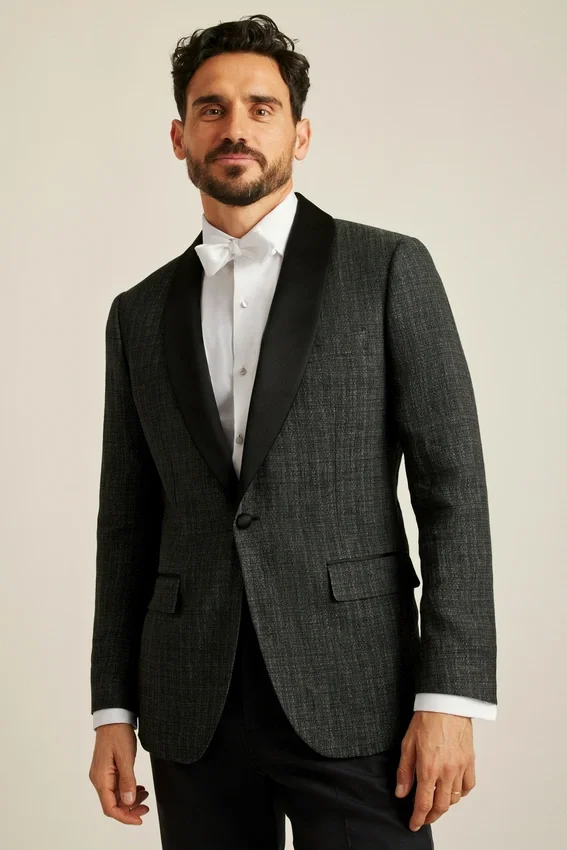 Una chaqueta de esmoquin de exhibición, impecablemente confeccionada en lino, ideal para bodas de verano.