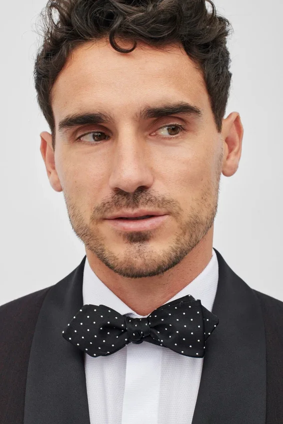 El modelo mide 1,88 m, tiene un contorno de pecho de 102 cm y lleva una chaqueta de traje 40R.