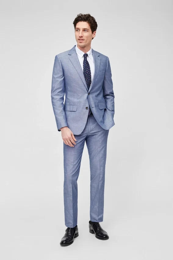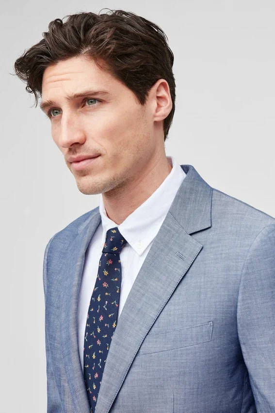 El modelo mide 1,88 m, tiene un contorno de pecho de 102 cm y lleva una chaqueta de traje 40R.