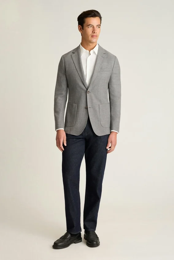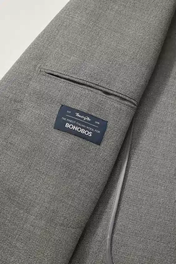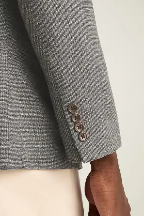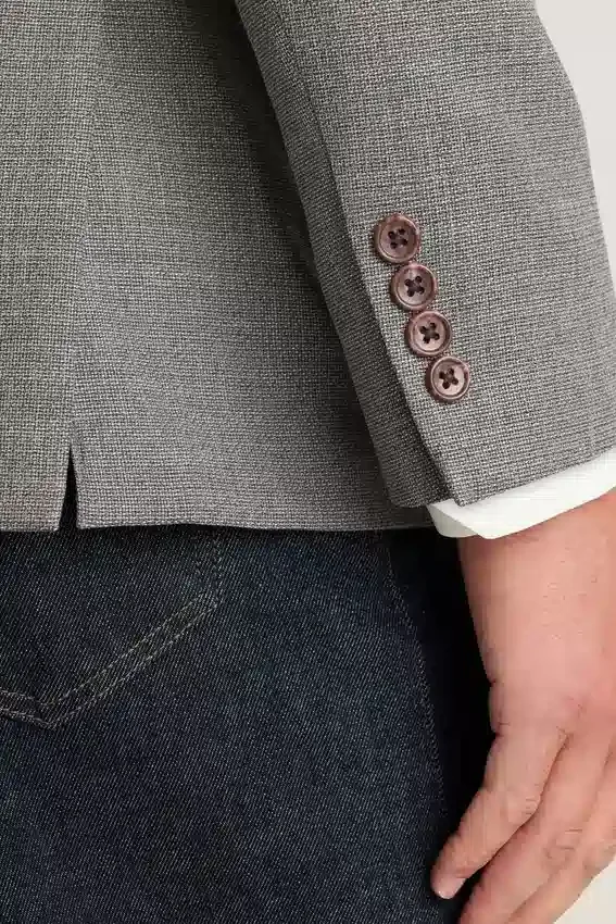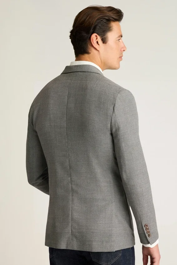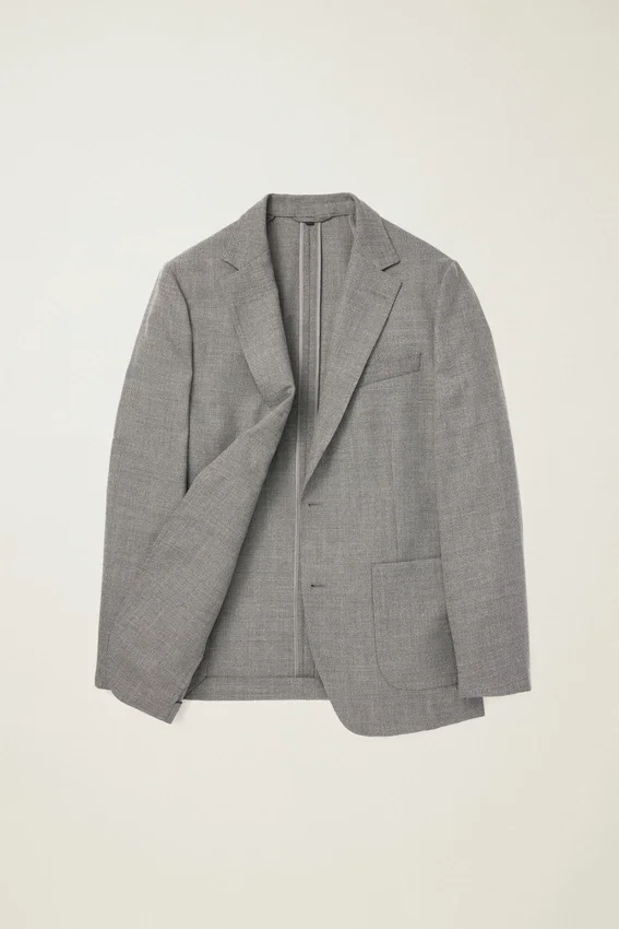 Construcción ligera y forro mínimo | Lana Hopsack transpirable de la fábrica italiana Marzotto | Solapa de 8,25 cm | Bolsillos de parche | Dos botones, corte sencillo | Interior sin forro con refuerzo en los hombros y ribete en las costuras | Forro en las mangas | Botones decorativos en los puños | Doble abertura trasera | Bolsillos interiores de ojal