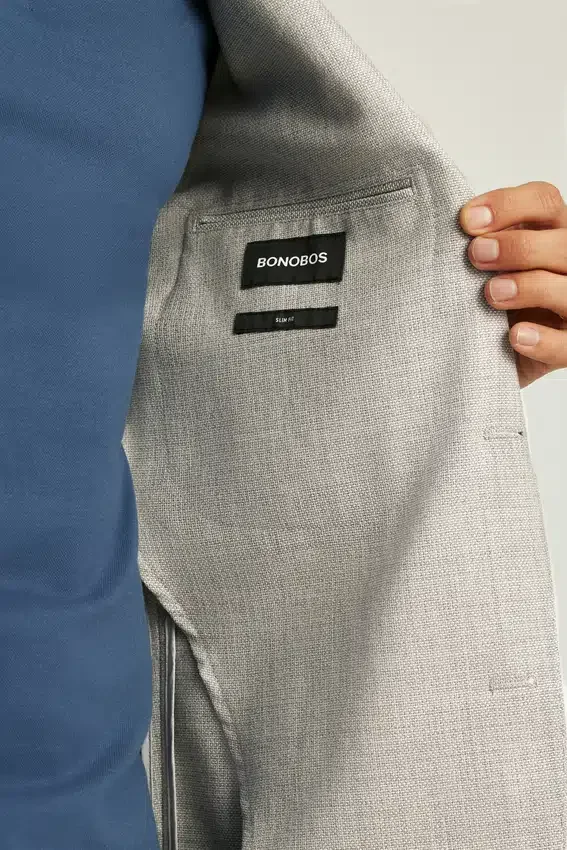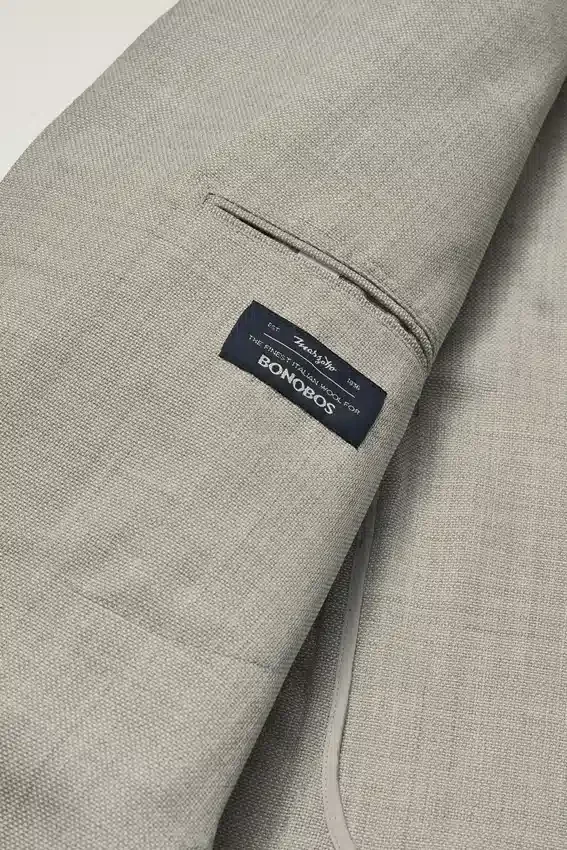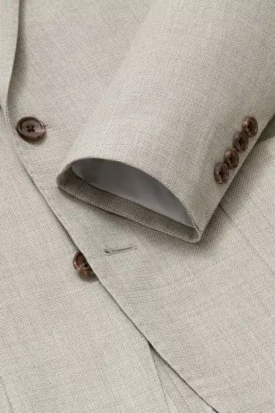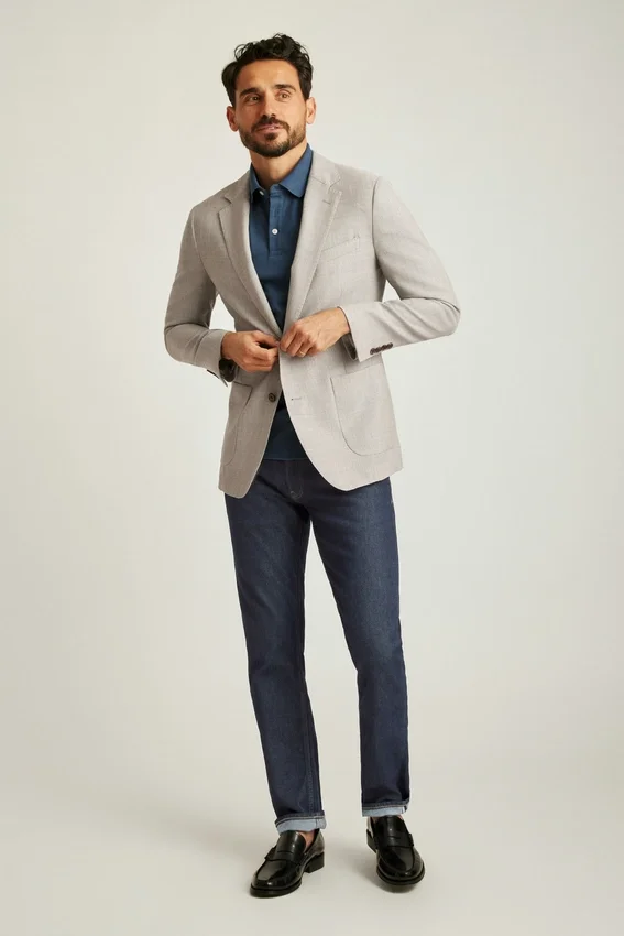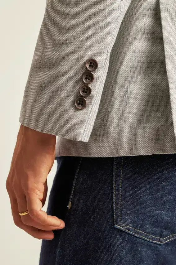 Construcción ligera y forro mínimo | Lana Hopsack transpirable de la fábrica italiana Marzotto | Solapa de 8,25 cm | Bolsillos de parche | Dos botones, corte sencillo | Interior sin forro con refuerzo en los hombros y ribete en las costuras | Forro en las mangas | Botones decorativos en los puños | Doble abertura trasera | Bolsillos interiores de ojal