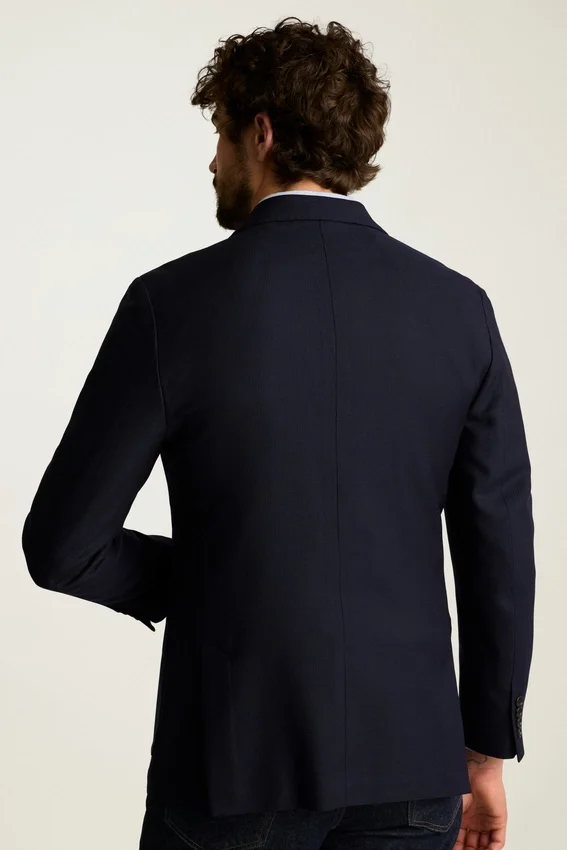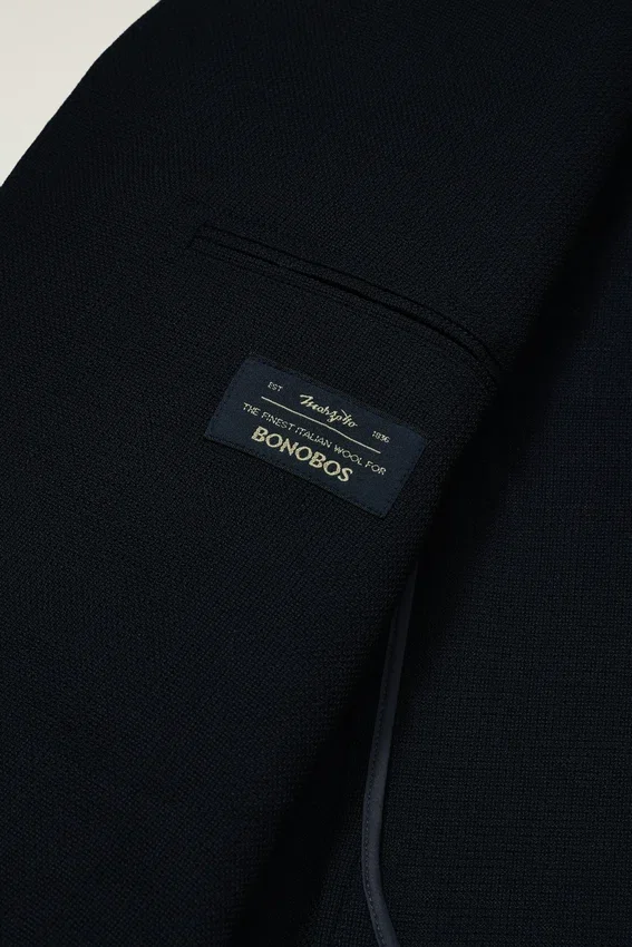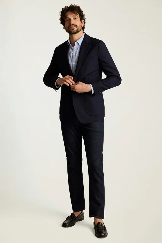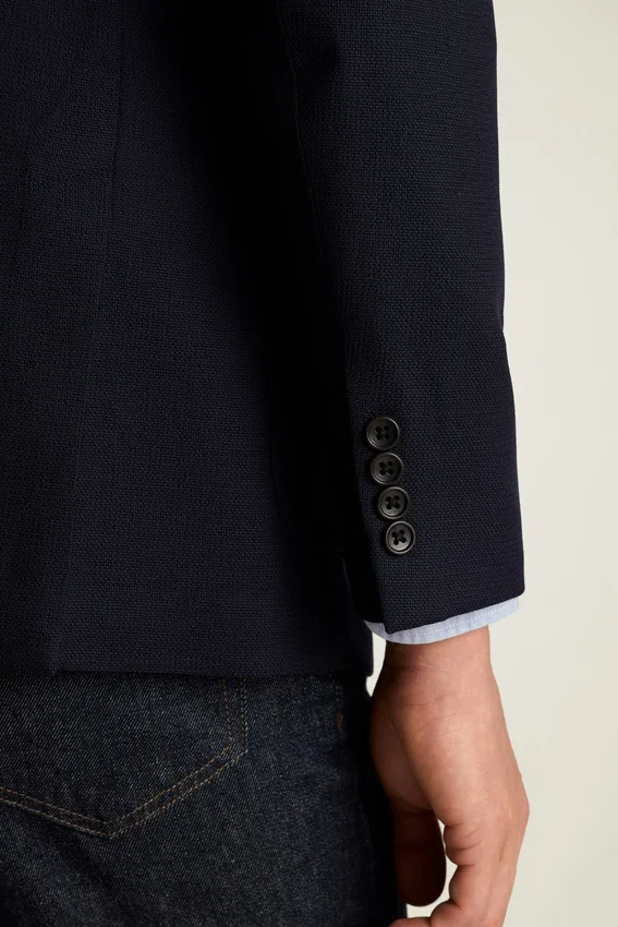 Construcción ligera y forro mínimo | Lana Hopsack transpirable de la fábrica italiana Marzotto | Solapa de 8,25 cm | Bolsillos de parche | Dos botones, corte sencillo | Interior sin forro con refuerzo en los hombros y ribete en las costuras | Forro en las mangas | Botones decorativos en los puños | Doble abertura trasera | Bolsillos interiores de ojal