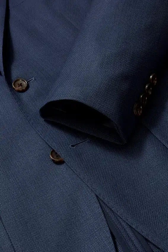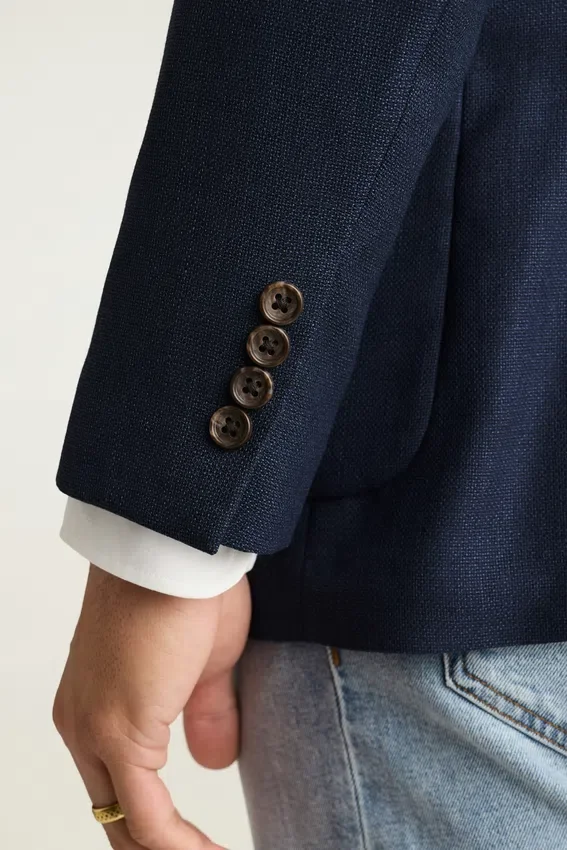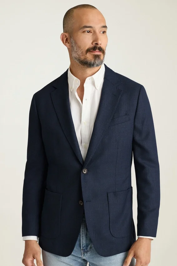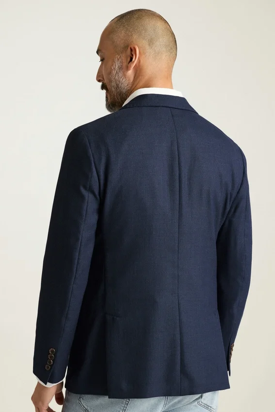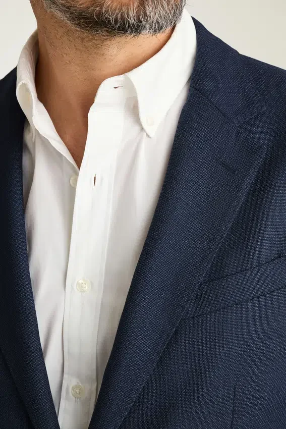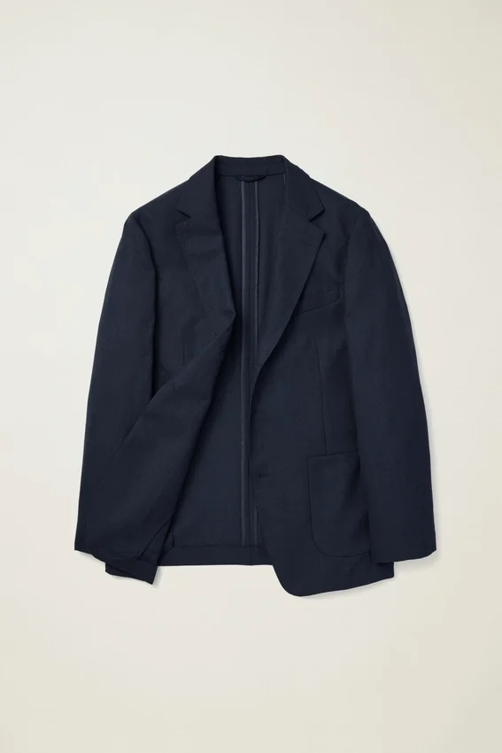 De construcción ligera y forro mínimo, esta chaqueta ligera está confeccionada con lana Hopsack transpirable de Marzotto. | Solapa de 8,25 cm | Bolsillos de parche | Dos botones, corte sencillo | Interior sin forro con refuerzo en los hombros y ribete en las costuras | Forro en las mangas | Botones decorativos en los puños | Doble abertura trasera | Bolsillos de ojal interiores